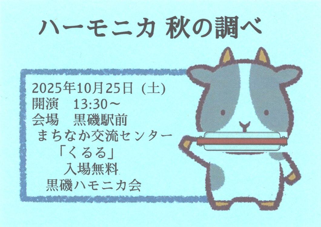 10月25日(土)は黒磯ハモニカ会の皆さんが黒磯駅前の街中交流センター「くるる」で13:30から2時間くらいの予定で演奏会を行います。私も2曲独奏を行います。