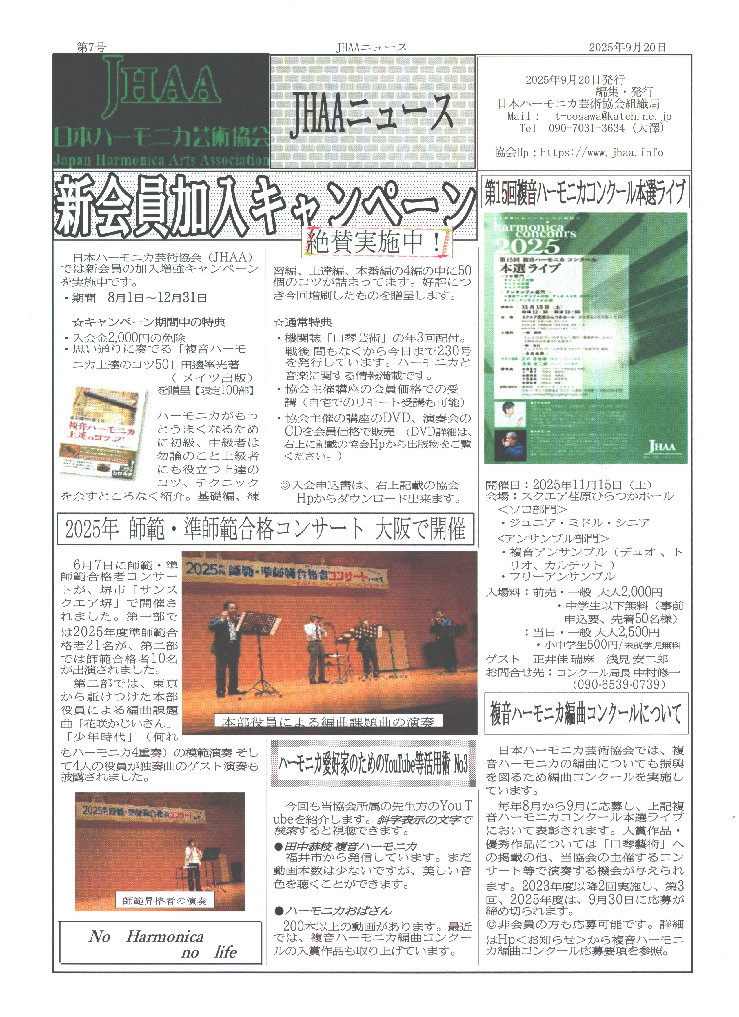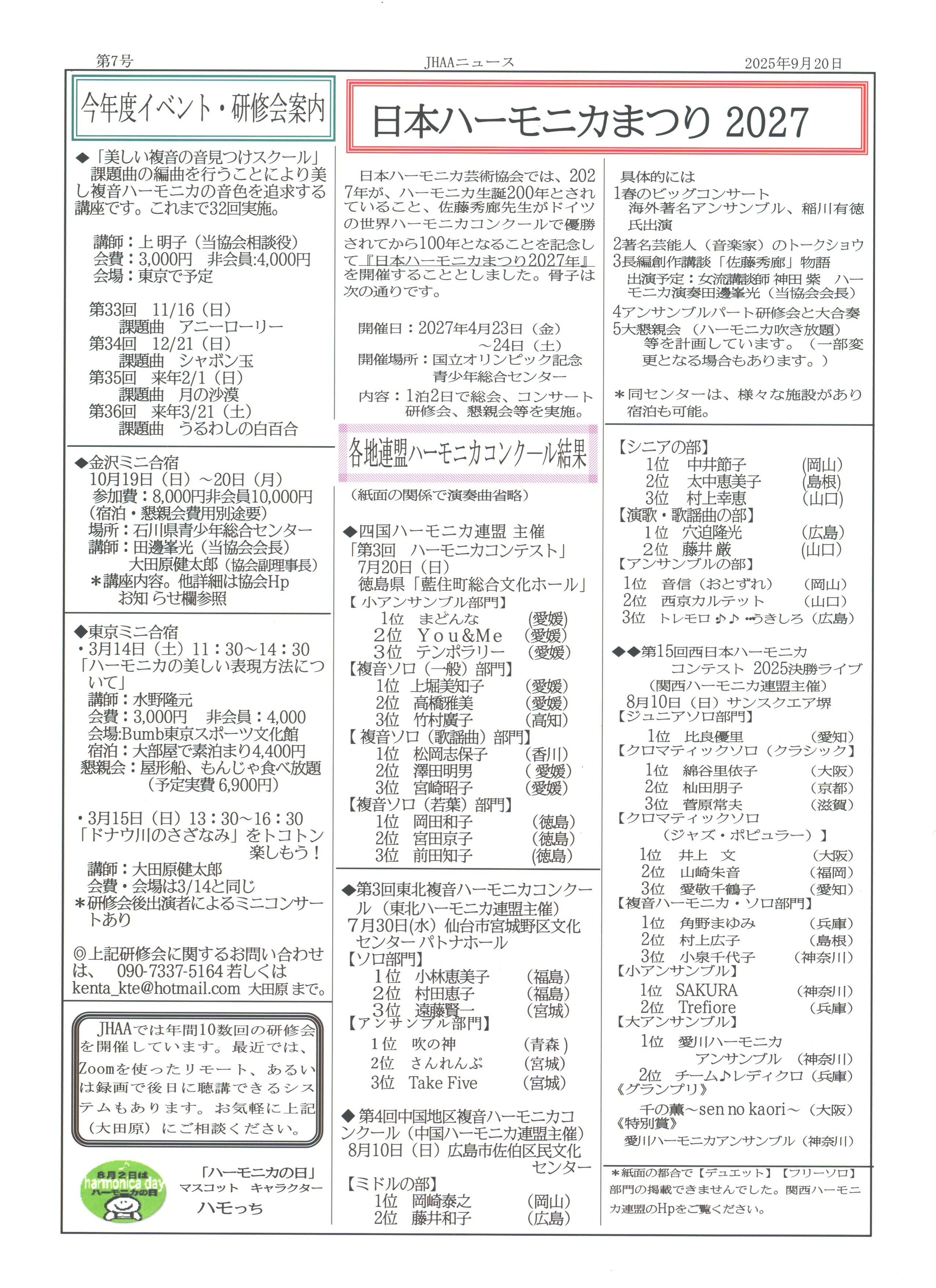 JHAAニュース 第7号9月20日発行のJHAAニュース第7号が届きました。このニュースにはJHAA(日本ハーモニカ芸術協会)からのお知らせやイベント・研修会の案内などが載っていますので、これからは届き次第ここで紹介しようと思います。